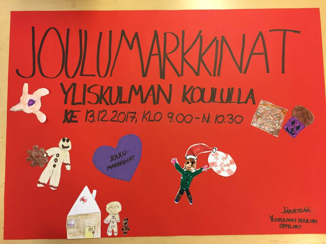 Yliskulman koulun oppilaat järjestää joulumarkkinat koululla keskiviikkona 13.12. klo 9.00 - 10:30. Tuotto käytetään oppilaskunnan kautta oppilaiden hyväksi. Tervetuloa kaikki perheenjäsenet, sukulaiset ja kyläläiset!