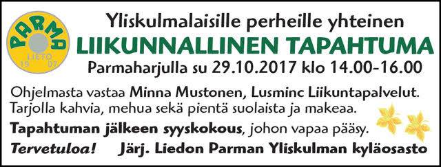 Liedon Parman Yliskulman kyläosasto järjestää liikunnallisen tapahtuman Yliskulmalaisille perheille Parmaharjulla su 29.9. klo 14 - 16.