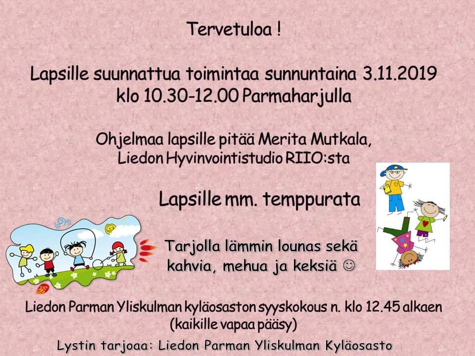 Liedon Parman Yliskulman Kyläosasto tarjoaa lapsille (n. 3 - 10 v.) suunnattua toimintaa Parmaharjulla sisätiloissa sunnuntaina 3.11.2019 klo 10.30 - 12.00.
