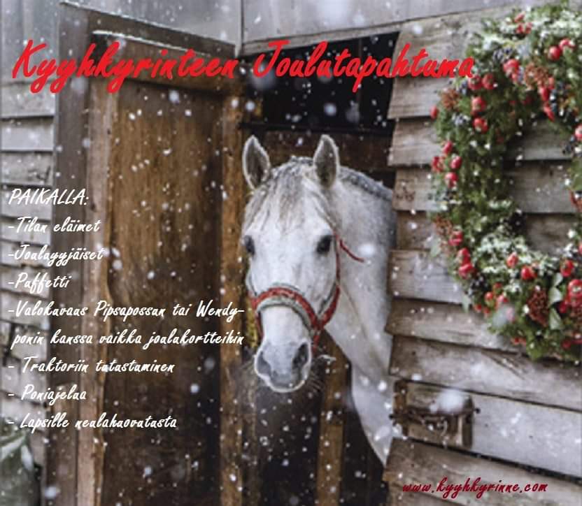 Kyyhkyrinteen kotieläintilalla järjestetään pieni tunnelmallinen joulunalustapahtuma su 1.12.2019. Talli on koristeltu idylliseen joulutunnelmaan josta löydät ihania käsitöitä joulumuistamiseksi ja pukinkonttiin. Tapahtumassa myös muuta ohjelmaa ja eläimiin pääsee tutustumaan. Katso tapahtuman lisätiedot Facebookista